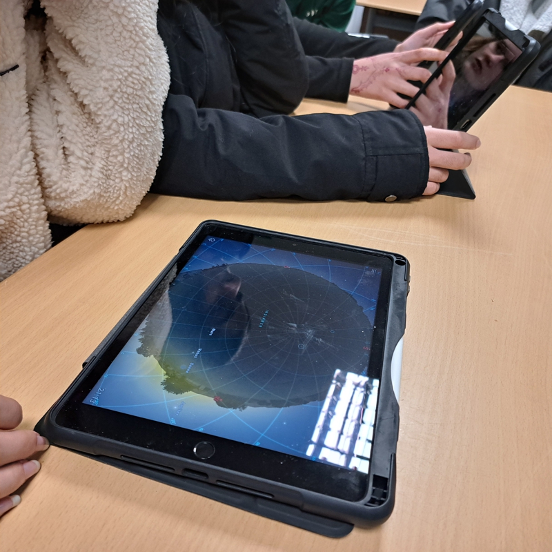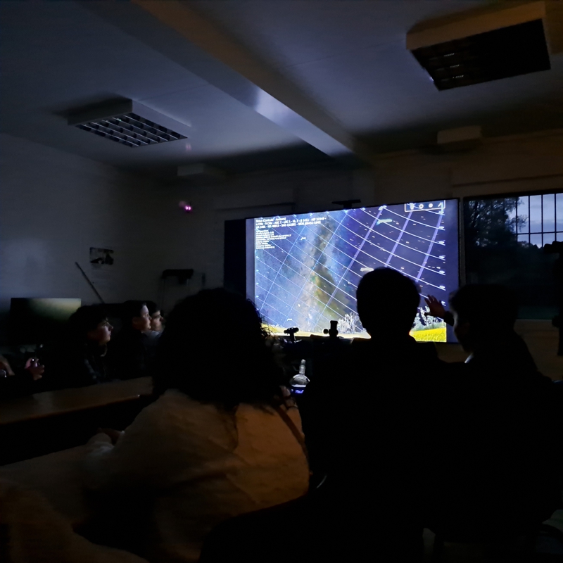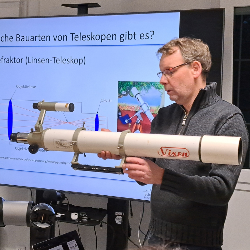 Zunächst erläuterte Lars Böker, wie es überhaupt zu diesem Neubau gekommen ist, was diese Sternwarte sogar mit einem Swimmingpool gemeinsam oder warum die Lichtverschmutzung die Sternwarte nach Hille gebracht hat. Danach ging es in den Schulungsraum und dort – umgeben von digitaler PC-Ausstattung wurden die verschiedenen Sichtinstrumente und ihre Funktionsweise vorgestellt. Dass bei höherer Auflösung immer weniger Himmelskörper im Fokus zu sehen sind, war nun allen klar. Und auch, dass nicht alle Sterne auf gleicher Höhe sind und wir mit dem Blick in den Himmel in die Vergangenheit reisen. Nun durften alle Besucher:nnen mittels einer besonderen App die aktuellen Positionen verschiedener Sternhaufen, Planeten oder Monde etc. digital verfolgen.