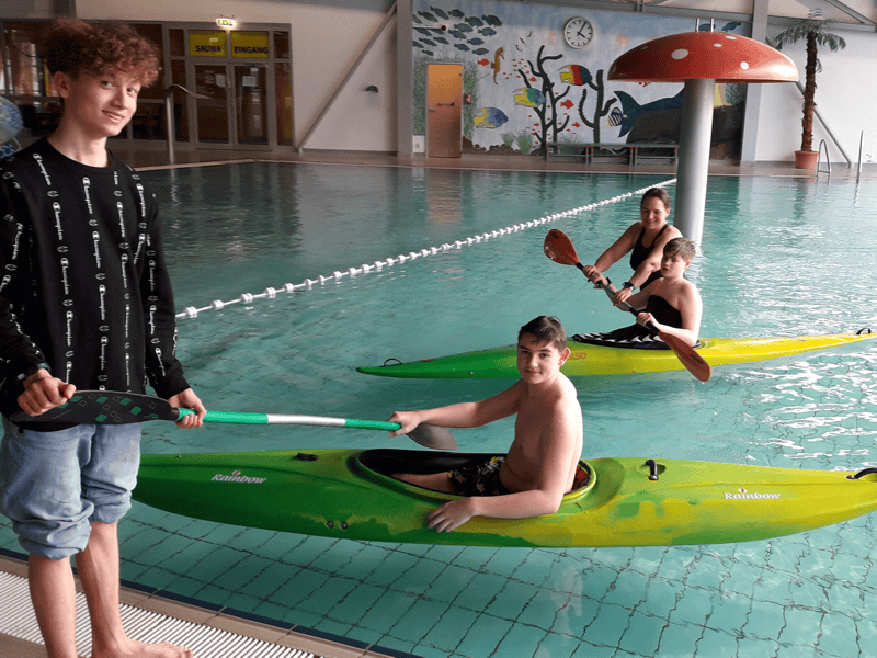 Zur Zeit übt die Gruppe im Melittabad das Paddeln unter besonderen Bedingungen im flachen Wasser (z.B. Aussteigen unter Wasser mit Spritzdecke) und hält sich fit für die kommende Frühjahrssaison, wenn es wieder auf die Weser geht.