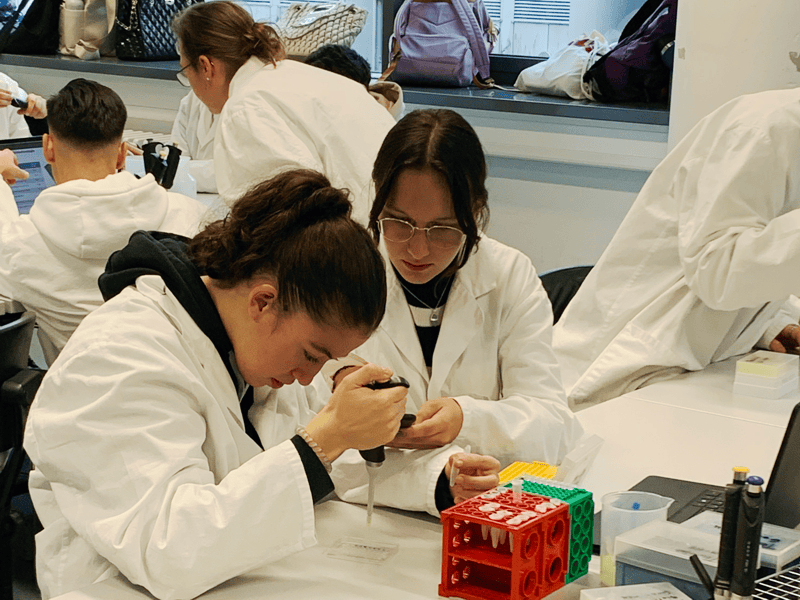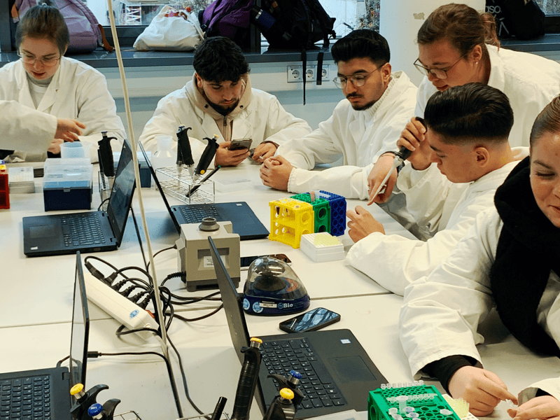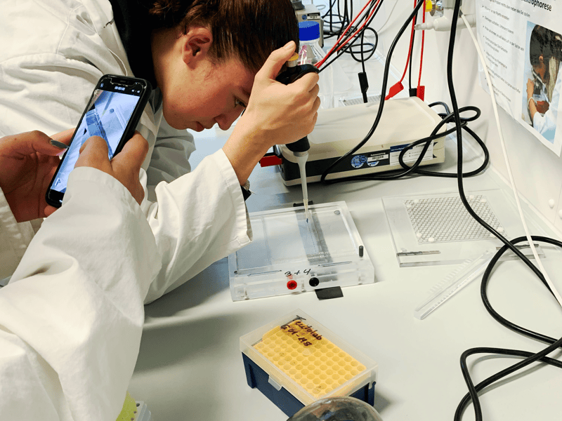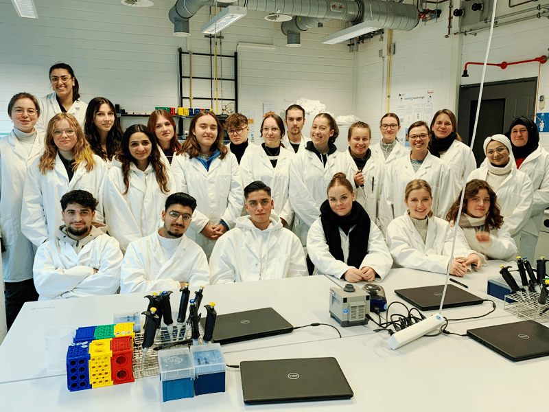 Die Biologieprüfungskandidaten der Jahrgangstufe Q1 (LK Frau Lüters, Gks Frau Buschmann und Frau Müller) haben dem Schülerlabor vom Teutolab Bielefeld einen Besuch abgestattet und sich einen ganzen Tag mit biotechnologischen Verfahren beschäftigt. Das Schülerlabor bietet Kurse zu abiturrelevanten Themen an, die sehr zeit- und materialintensiv sind, so dass sie in einer normalen Unterrichtsstunde gar nicht durchgeführt werden könnten. Thematisch ging es darum herauszufinden, welche Fleischsorte in der Wurst steckt und ob die Angaben auf dem Etikett richtig sind, dazu musste ein DNA-Profil der Wurst erstellt werden und mit DNA-Profilen bekannter Tierarten verglichen werden. Um das alles herauszufinden wurde die DNA zunächst extrahiert, danach durch eine PCR vervielfältigt und am Ende in einer Gelelektrophorese als Banden sichtbar gemacht.