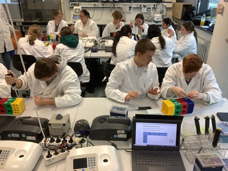 Mit Unterstützung pipettierten und zentrifugierten die Schülerinnen und Schüler unterschiedliche Proben von Coronaviren, welche dann mittels Polymerase Kettenreaktion (PCR) vermehrt wurden. Anschließend untersuchten sie mit der international genutzten Software zur Analyse genetischer Daten »MEGA« unterschiedliche Coronastämme auf Gemeinsamkeiten und Unterschiede und konnten daraufhin Rückschlüsse zum Ursprung der Corona-Pandemie ableiten. Die Ergebnisse der PCR und anschließenden Gelelektrophorese stehen nachfolgend für die Weiterarbeit im Unterricht zur Verfügung. Mit viel Interesse und Neugierde forschten die Jugendlichen an der Entstehung der Pandemie
