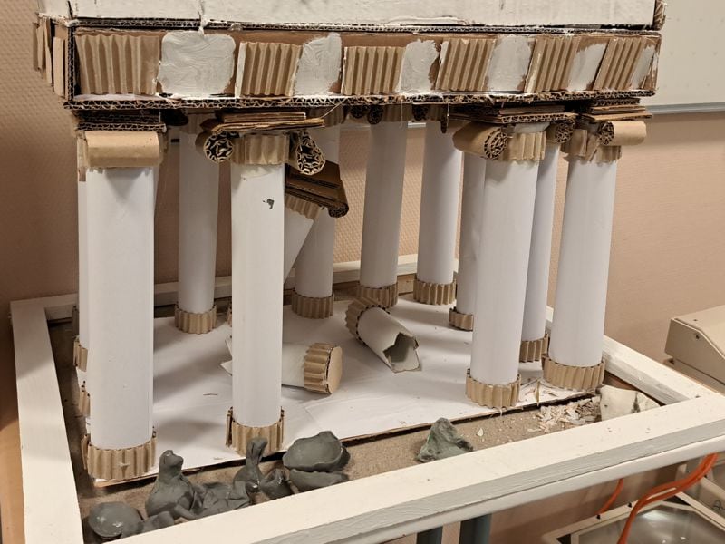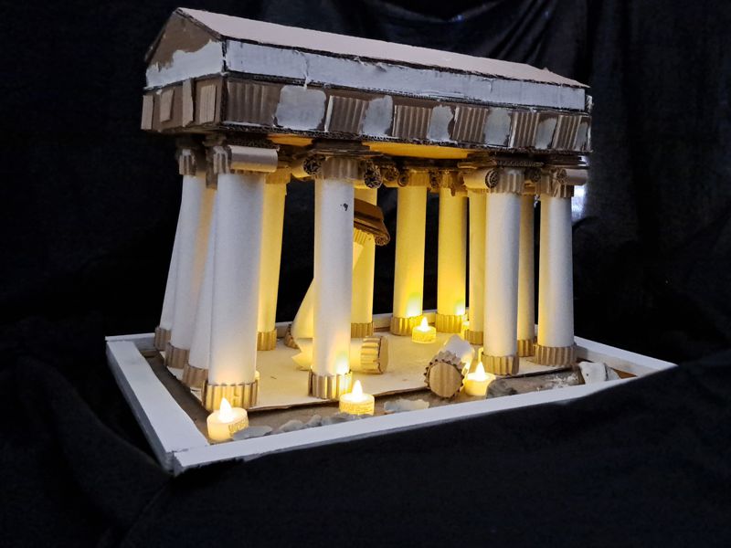 Eine Gruppe entschied sich dafür, den Berg Olymp als Diorama zu planen und kreativ umzusetzen. Dafür wurde im Internet recherchiert, Skizzen angefertigt und Material zusammengetragen. Am Ende entstand mit viel Liebe zum Detail ein tolles modelliertes und farbig ausgearbeitetes Diorama mit schneebedeckten Gipfeln und einer schönen Landschaft am Boden. Verarbeitet wurden Gips, Sand, Stoff, Naturmaterialien und Farben. Auf das Ergebnis können Stine und Tharan sehr stolz sein. Auch die zweite Gruppe mit Bola, Faith und Isa hatte sich ein anspruchsvolles Projekt vorgenommen und sich das Ziel gesetzt, einen griechischen Tempel zu bauen. Papierrollen, Wellpappe, Klebepistole, Farbe sowie Modelliermasse kamen hier zum Einsatz. LED-Lichter rücken den Tempel nun in eine eindrucksvolle Atmosphäre.Auch für die Lehrkräfte war der Prozess sehr spannend, denn es gab natürlich auch einmal schwierige Phasen der Umsetzung. Aber das wurde toll gemeistert und alle Gruppenmitglieder brachten sich super ein.