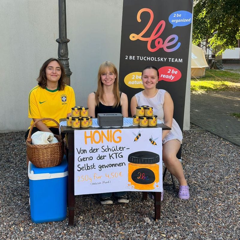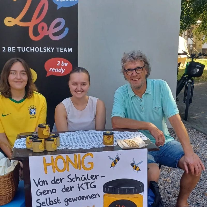 Anfang September fand in Minden das Schnurrviertelfest statt, ein Flohmarkt, auf dem allerlei Waren verkauft wurden. Auch die Schülergenossenschaft der KTG Minden, das Tucholsky Team, war dort in Form von drei Mitgliedern vertreten und hat Produkte aus einem ihrer vielfältigen Geschäftsfelder an einem einladenden Stand verkauft. Es handelt sich um Bio-Honig aus der Schulimkerei. Die Schulimkerei stellt ein Geschäftsfeld der Genossenschaft dar und produziert diesen eigenhändig in der Schule. Der leckere Bio-Honig wurde am Stand des Tucholsky Teams verkauft und kam gut an, denn die Kunden lobten den Geschmack des köstlichen Honigs, woraufhin alle 20 Gläser von den Besuchern des Schnurrviertelfests gekauft wurden.