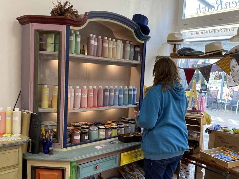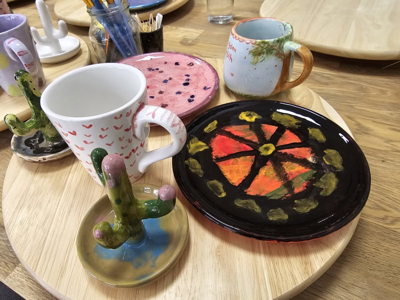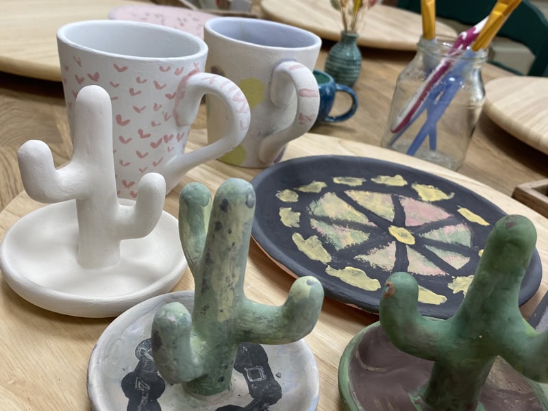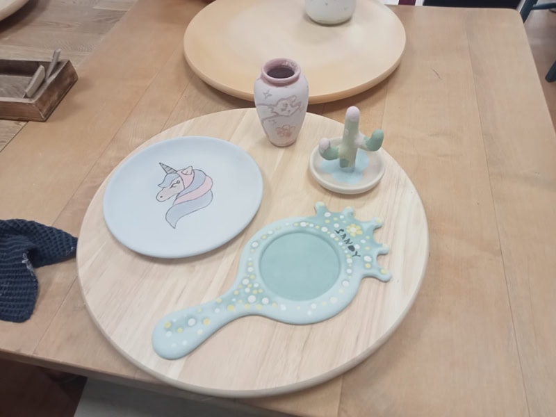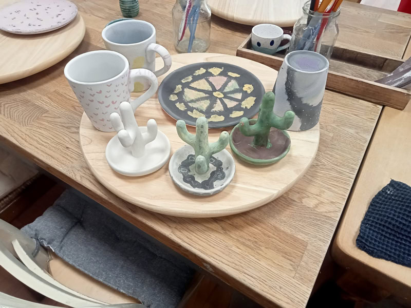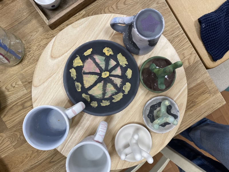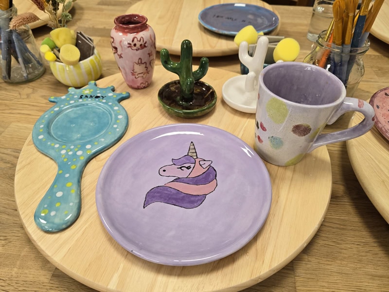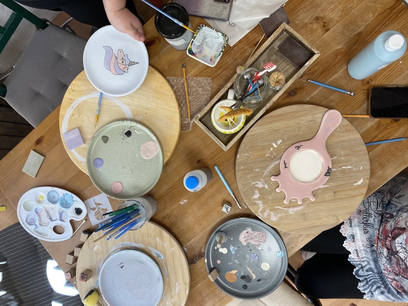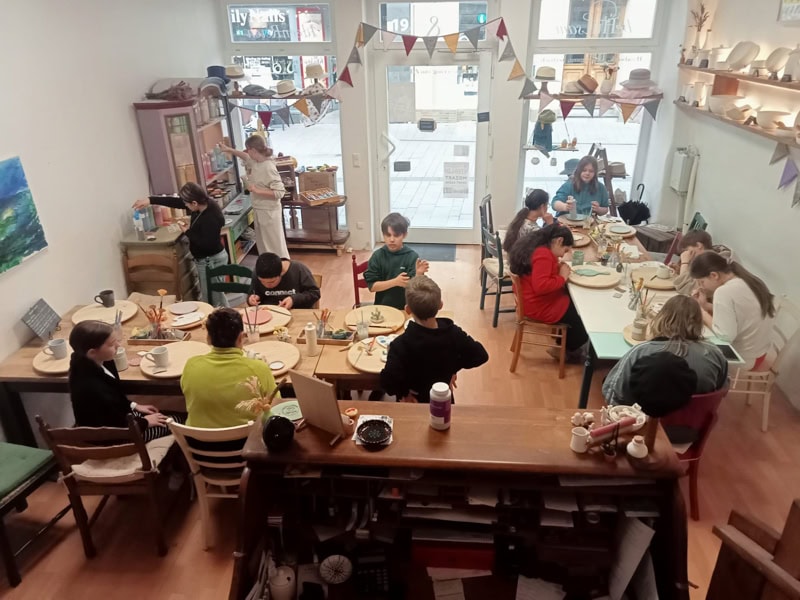 Wie auch schon im letzten Jahr kamen alle Teilnehmer:innen vom Keramikworkshop begeistert zurück. Eine tolle Auswahl an Tassen, Tellern, Bechern und vielem mehr sowie ein riesiger Schrank voller Keramikfarben, Pinsel, Schwämmchen, … ein Paradies für die Teilnehmerinnen aus der 5. Klasse. Die Schülerin Pauline sowie die Lehrerin Seha Ritter und die Praktikantin Zoe Bierbaum begleiteten den Workshop und waren auch sehr angetan.