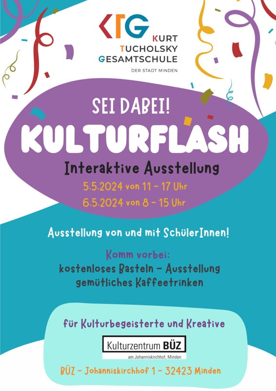 Am 5. und 6. Mai zeigen wir nun die tollen Ergebnisse unseres Konzeptes und freuen uns bei interaktiven Kulturangeboten im BÜZ | Johanniskirchhof 1 | 32423 Minden auf viele Gäste! Komm vorbei und sei ein Teil vom »Kulturflash präsentiert« der KTG!