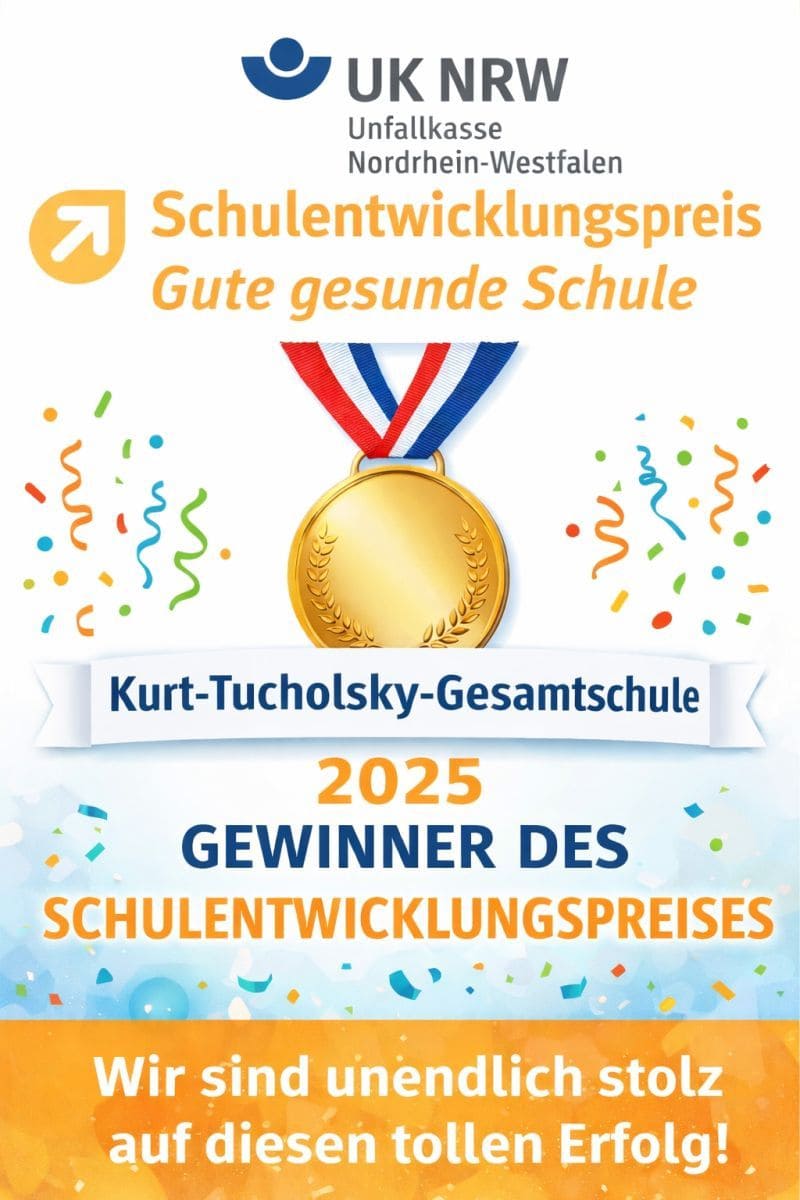 Große Freude an der Kurt-Tucholsky-Gesamtschule in Minden: Die Schule wurde im Jahr 2025 mit dem renommierten Schulentwicklungspreis der Unfallkasse NRW ausgezeichnet. Das Schwerpunktthema des Preises lautete „gute gesunde Schule“ – ein Bereich, in dem die Kurt-Tucholsky-Gesamtschule seit Jahren konsequent und mit großer Überzeugung arbeitet.