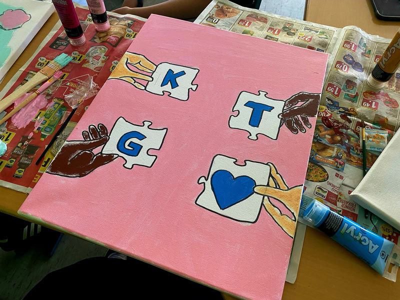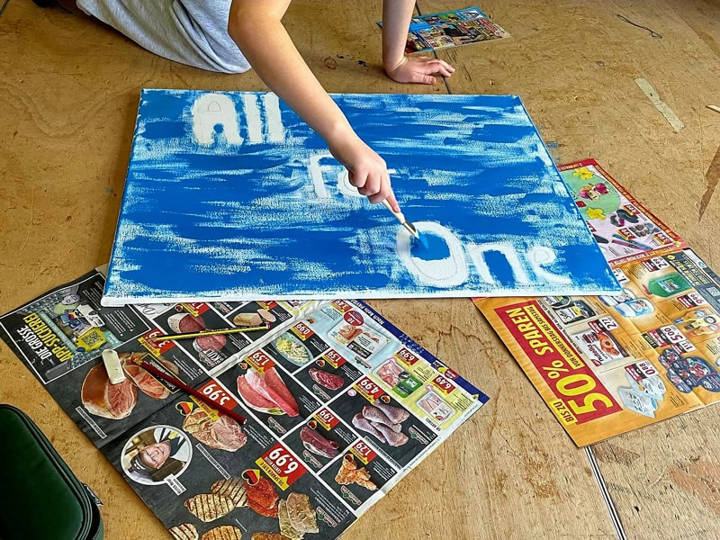 Eine kurze Einführung in die Kunst des Graffiti, danach wird mit Acrylfarben auf großen Leinwänden gemalt. Es entstehen tolle Kunstwerke, die eine gemeinsame Botschaft haben: Eine:r für alle!